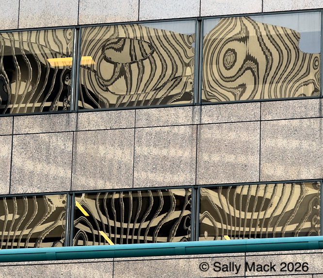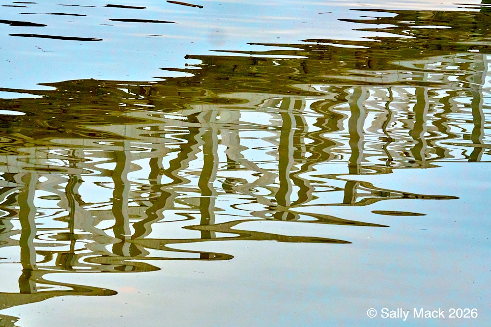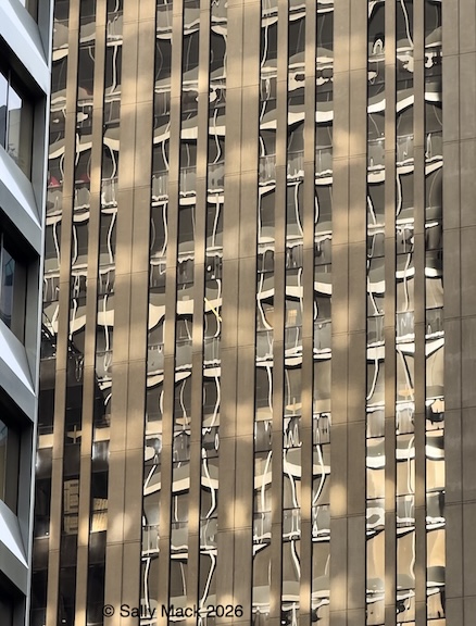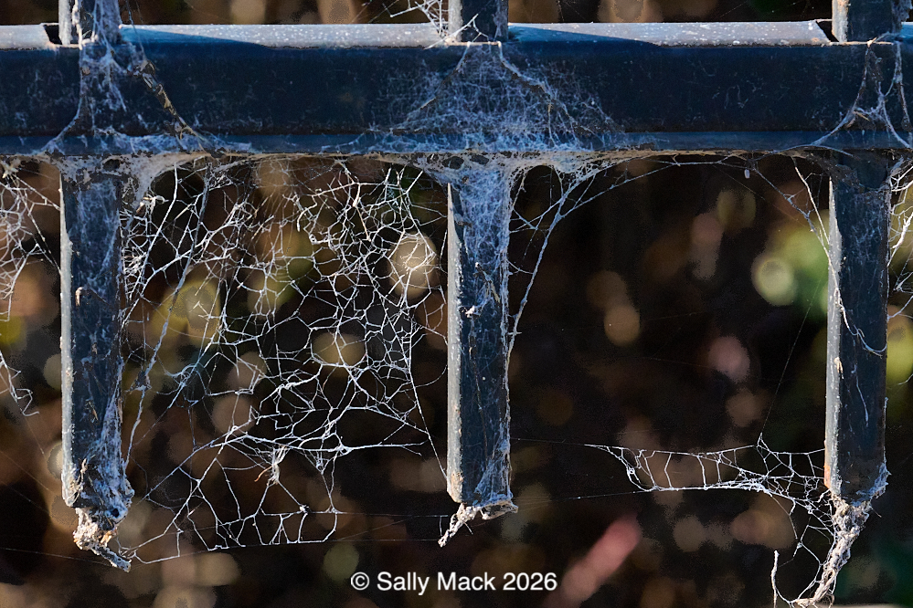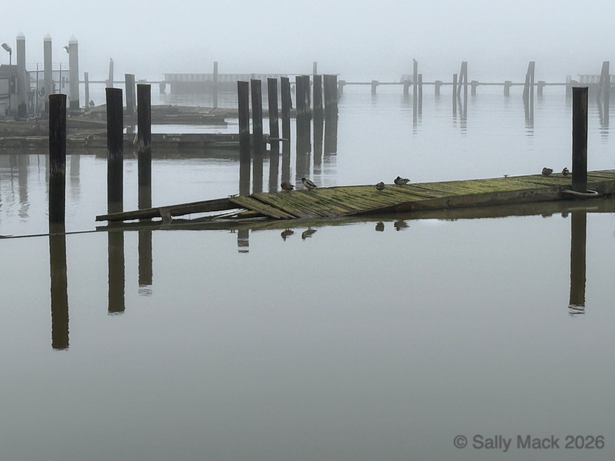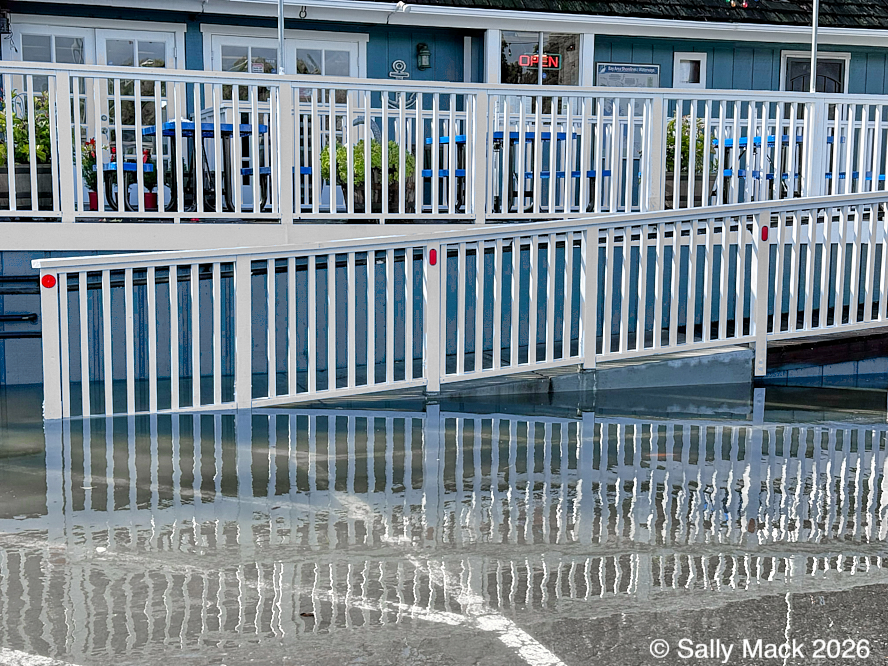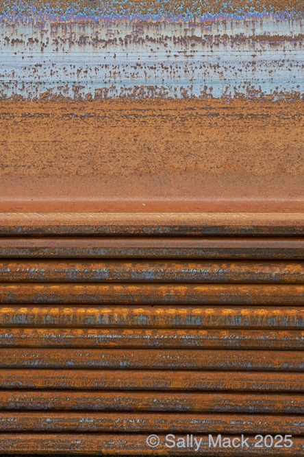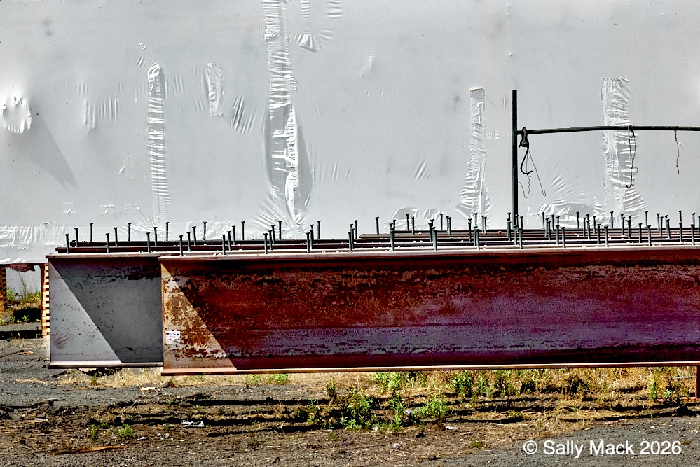 Steel I-beams with shear studs in front of white shrink-wrapped tiny house on weedy lot, Mare Island CA
